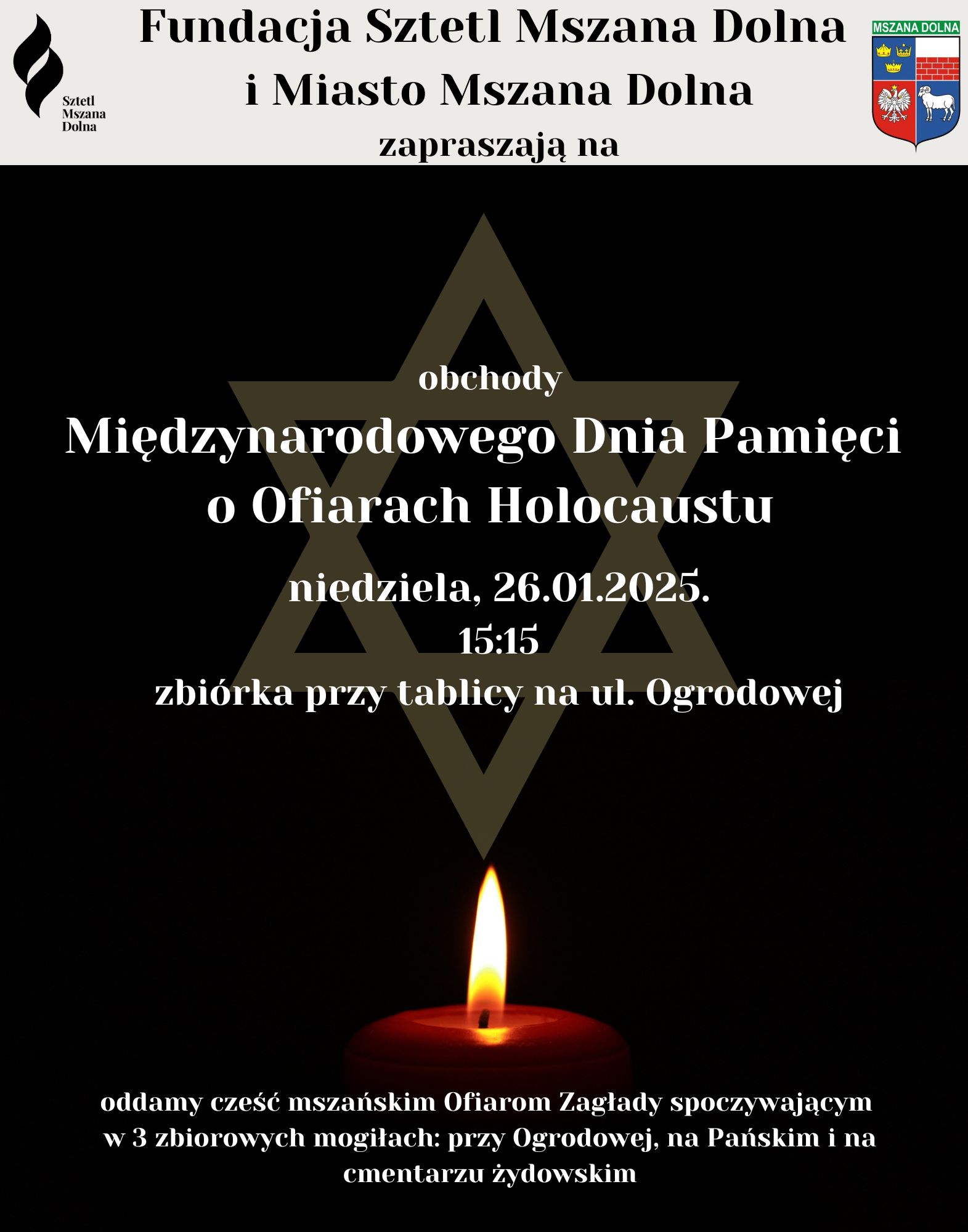 – Wraz z władzami miasta zapraszamy do uczczenia pamięci Ofiar Zagłady w Mszanie Dolnej, stąd pochodzących, oraz tu zamordowanych. Spotkamy się przy trzech zbiorowych mogiłach Ofiar: przy ul. Ogrodowej, na Pańskim oraz na cmentarzu żydowskim. Rozpoczęcie przy tablicy pamiątkowej przy ul. Ogrodowej, w niedzielę, 26.01.2025 r. o godz. 15:15. Można przynieść znicz, kamyk. Mężczyzn prosimy o nakrycie głowy. Przy mogiłach odmówimy Psalmy, zapalimy światło pamięci, oddamy cześć pomordowanym – informuje Fundacja Sztetl Mszana Dolna.