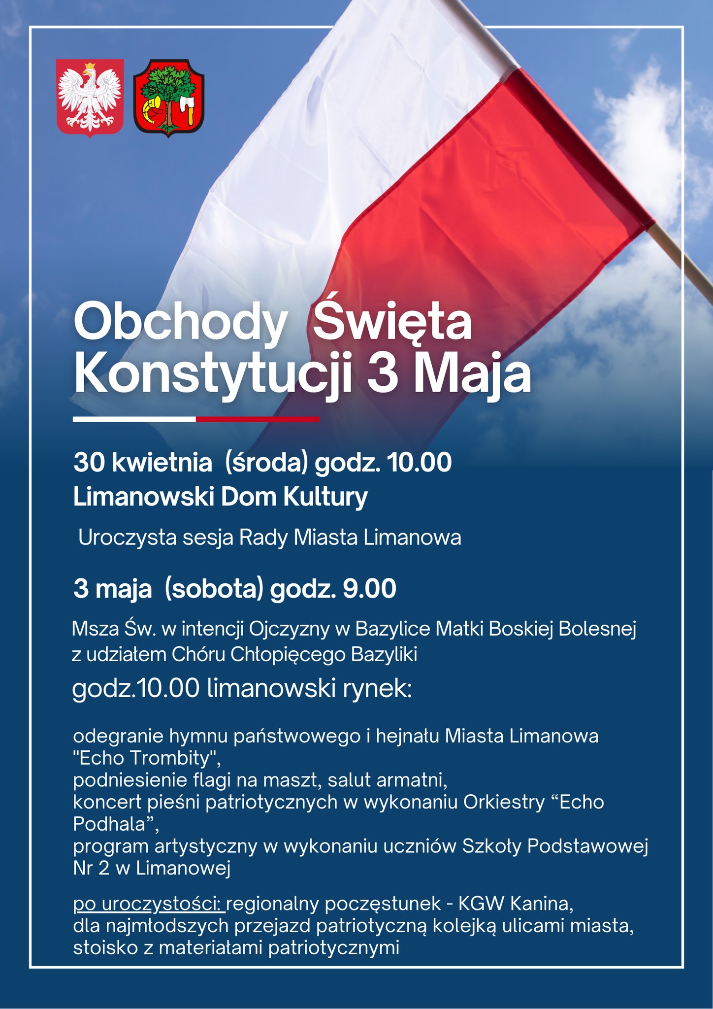 Urząd Miasta Limanowa zaprasza do wspólnego świętowania 234. rocznicy uchwalenia Konstytucji 3 maja.