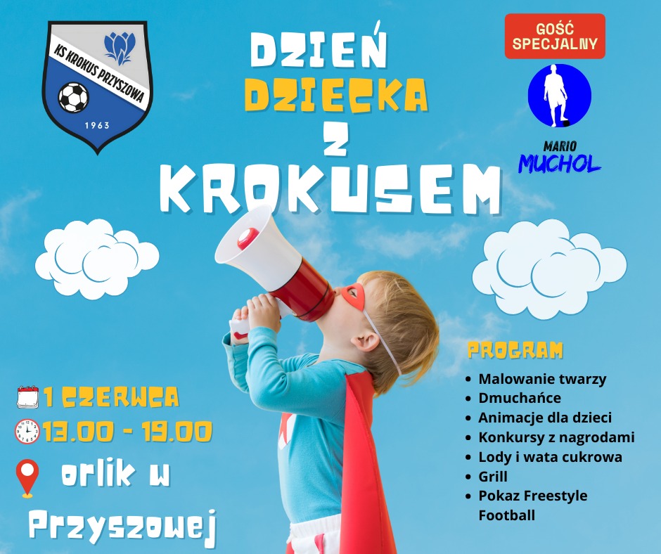 KS Krokus Przyszowa zaprasza na piknik z okazji Dnia Dziecka. Wydarzenie odbędzie się 1 czerwca na Orliku w Przyszowej. Rozpoczęcie o godz. 13.00.