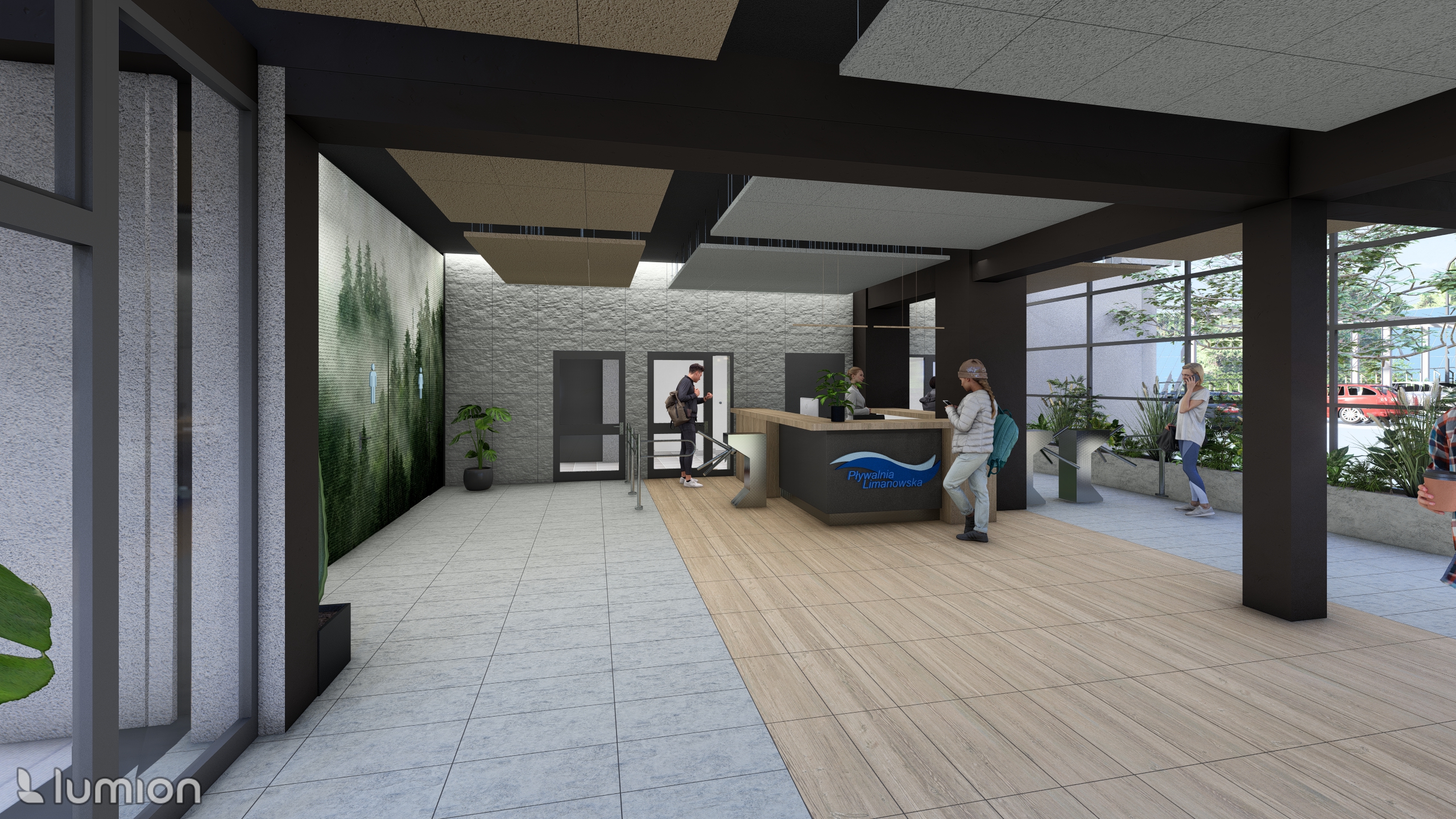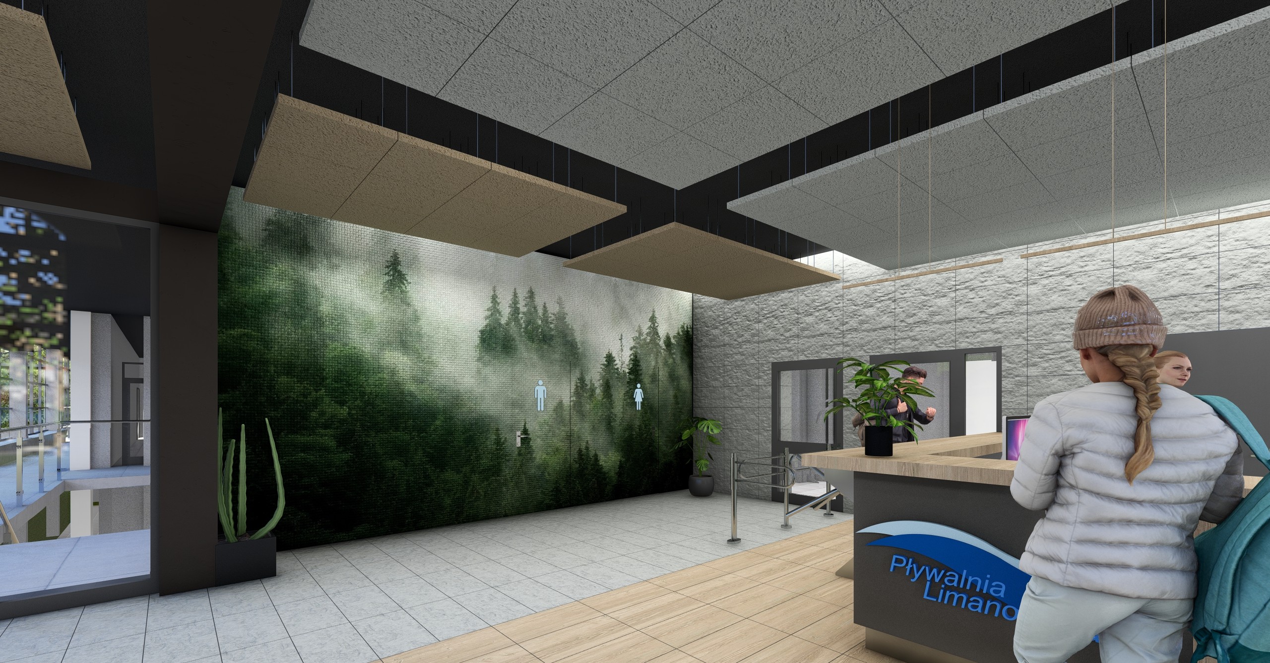 Głównym założeniem planowanych prac jest poprawa ciągu komunikacyjnego w obsłudze klientów. Zmiana wystroju wiąże się także z nowoczesną aranżacją tego miejsca. W zakresie przebudowy, demontażowi ulegnie ścianka fasadowa wraz z drzwiami przesuwnymi, wydzielająca przestrzeń strefy kasowej od głównego holu wejściowego. W przestrzeni holu zlokalizowana będzie recepcja wydzielona ladą. Recepcja, podkreślona zostanie naprowadzającym rysunkiem posadzki i wyróżniającym się kolorystycznie sufitem. Demontażowi ulegnie również ściana przesłaniająca wejścia do toalet. Na odsłoniętej ścianie położna zostanie fototapeta. W strefie szatniowej zainstalowanych zostanie 5 nowych przebieralni oraz dodatkowo 28 szafek. Ponadto, w ramach przebudowy