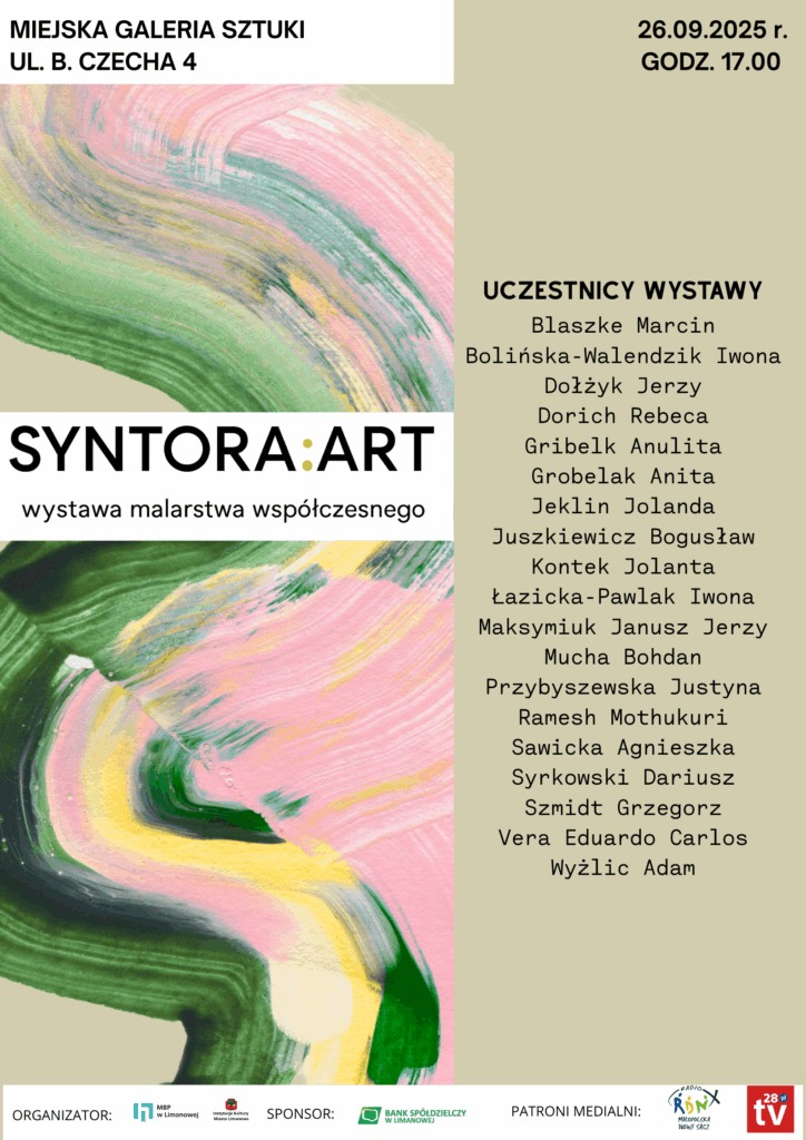 Miejska Biblioteka Publiczna w Limanowej zaprasza na uroczysty wernisaż wystawy zbiorowej „SYNTORA:ART”, poświęconej współczesnemu malarstwu. Wydarzenie odbędzie się 26 września o godz. 17.00 w Miejskiej Galerii Sztuki w Limanowej.