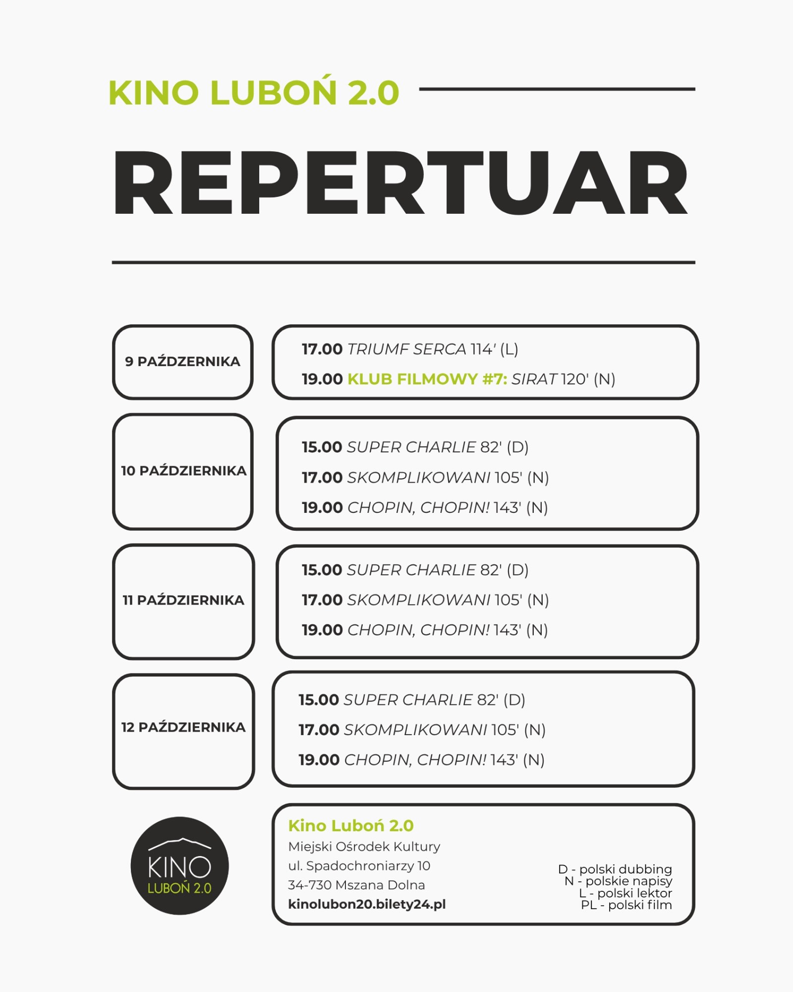 Prezentujemy repertuar kina „Luboń 2.0” w Mszanie Dolnej do 12 października i zachęcamy do skorzystania z oferty.