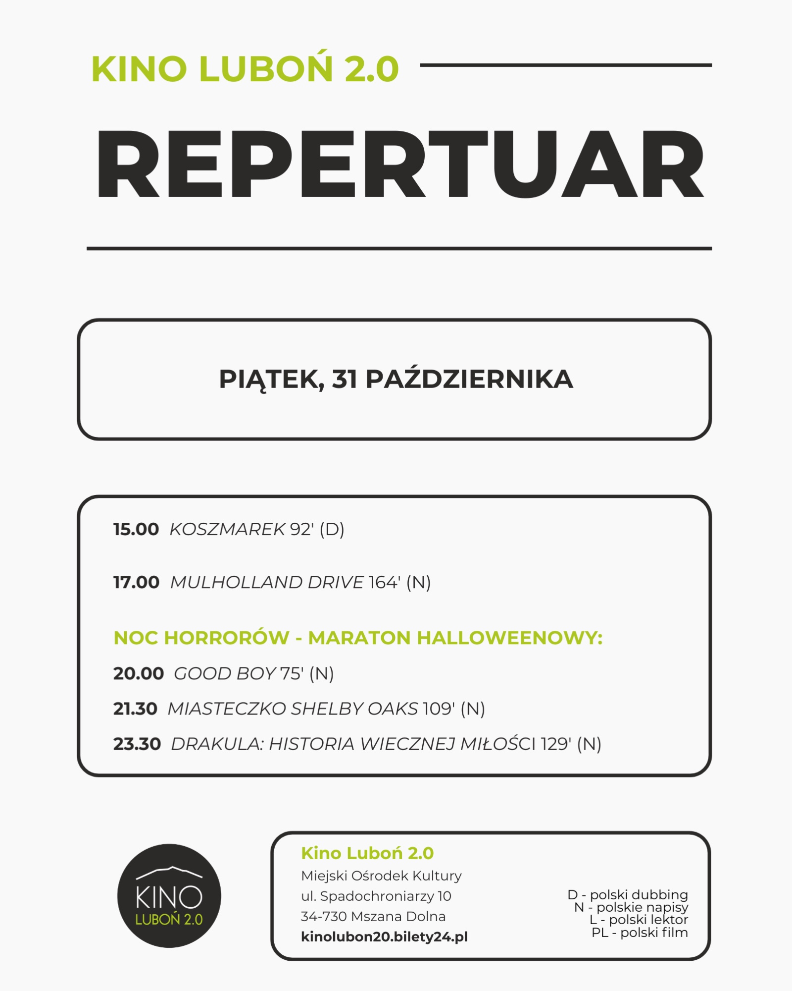 31 października kino „Luboń 2.0” w Mszanie Dolnej zaprasza na noc horrorów.