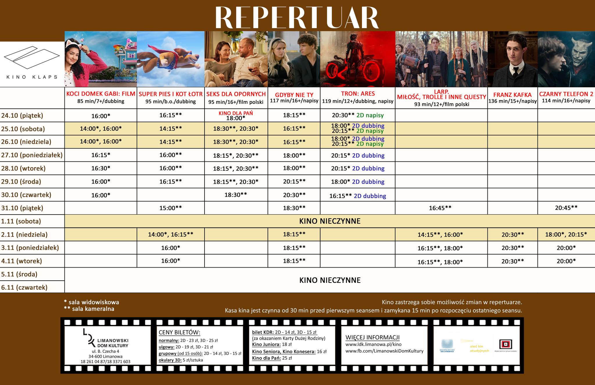 Kino „Klaps” w Limanowej zaprasza do korzystania z oferty. Prezentujemy repertuar obowiązujący do 6 listopada.
