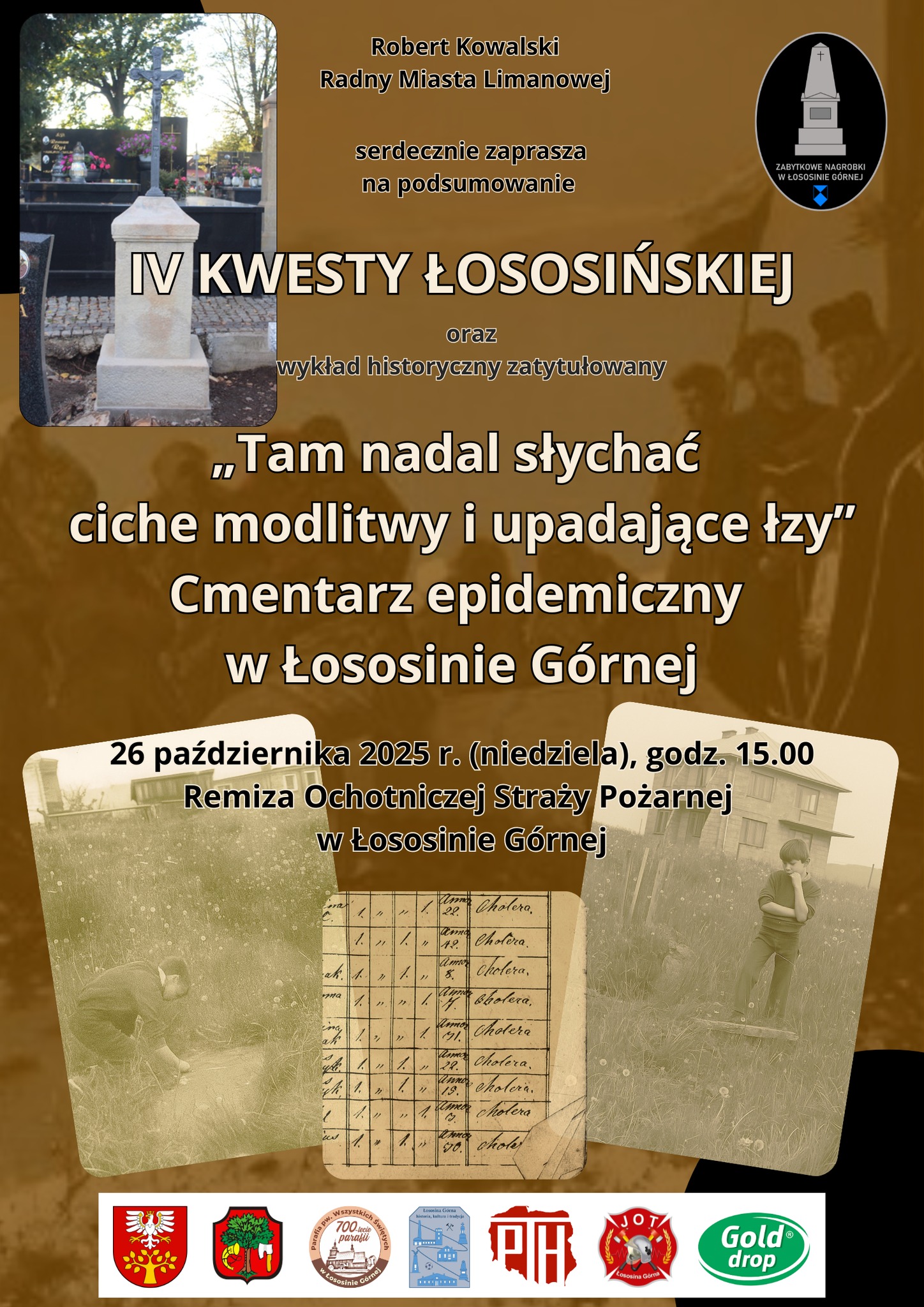 26 października w remizie Ochotniczej Straży Pożarnej w Łososinie Górnej odbędzie się podsumowanie IV Kwesty Łososińskiej połączone z wykładem pt. „Tam nadal słychać ciche modlitwy i upadające łzy. Cmentarz epidemiczny w Łososinie Górnej”. Na to wydarzenie zaprasza radny miasta Limanowa – Robert Kowalski. Rozpoczęcie o godz. 15.00.