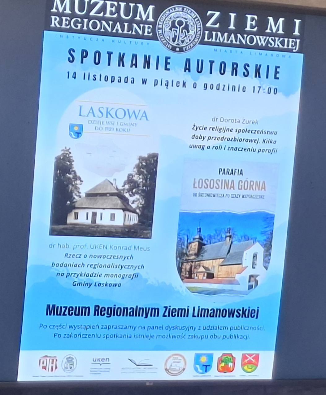 W Muzeum Regionalnym Ziemi Limanowskiej odbyło się spotkanie autorskie z dr Dorotą Żurek oraz prof. Konradem Meusem, współautorami książek: „Laskowa: Dzieje wsi i gminy do 1989 roku” i „Parafia Łososina Górna od średniowiecza po czasy współczesne”.