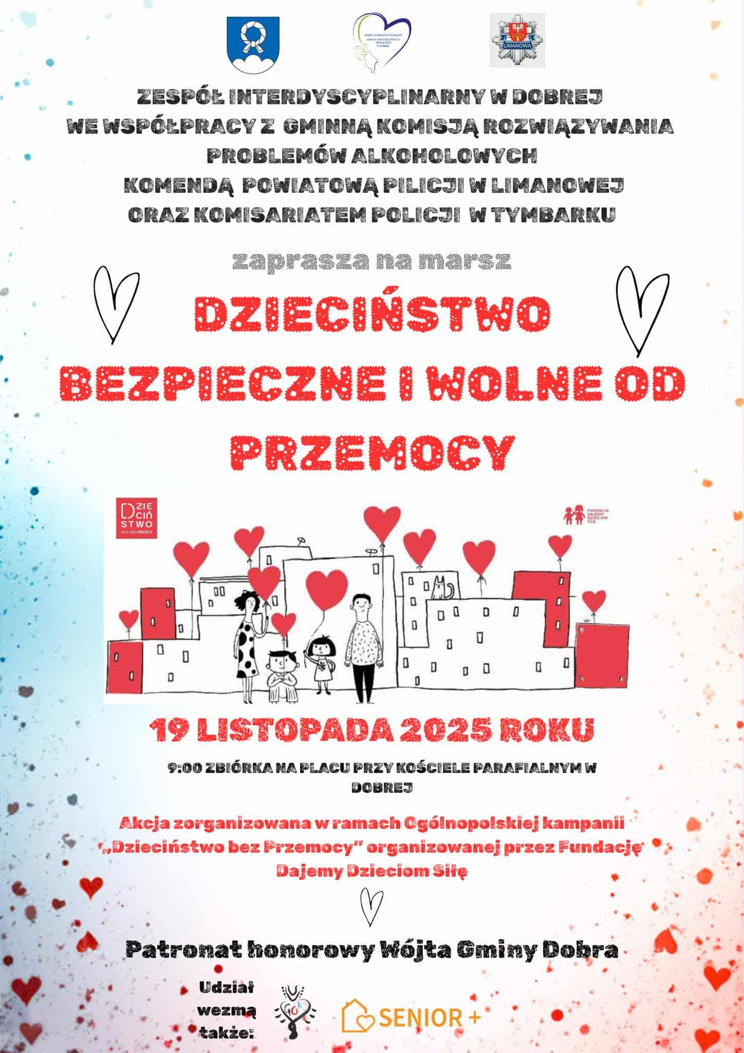 19 listopada ulicami Dobrej przejdzie marsz w ramach ogólnopolskiej kampanii „Dzieciństwo bez przemocy”. Do udziału w tym wydarzeniu zapraszają: Zespół Interdyscyplinarny w Dobrej, Gminna Komisja Rozwiązywania Problemów Alkoholowych, Komenda Powiatowa Policji w Limanowej oraz Komisariat Policji w Tymbarku. Rozpoczęcie o godz. 9.00 na placu przy kościele parafialnym.