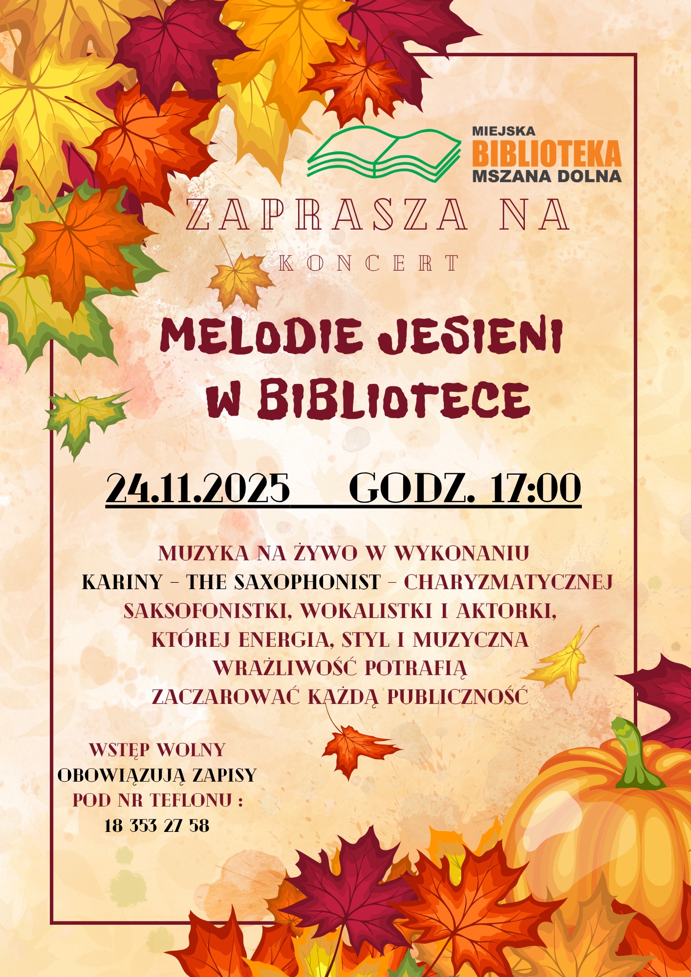 24 listopada w Miejskiej Bibliotece w Mszanie Dolnej odbędzie się koncert pt. „Melodie jesieni w bibliotece”. Wystąpi Karina – The Saxophonist. Rozpoczęcie o godz. 17.00.