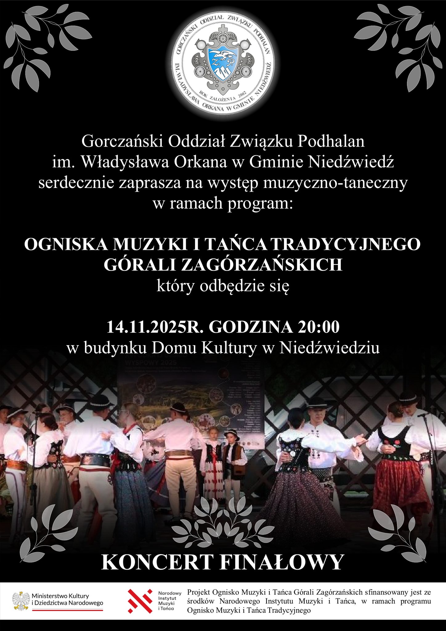 Gorczański Oddział Związku Podhalan w gminie Niedźwiedź zaprasza na występ muzyczno-taneczny w ramach programu ogniska muzyki i tańca tradycyjnego Górali Zagórzańskich. Wydarzenie odbędzie się 14 listopada o godz. 20.00 w Domu Kultury w Niedźwiedziu.