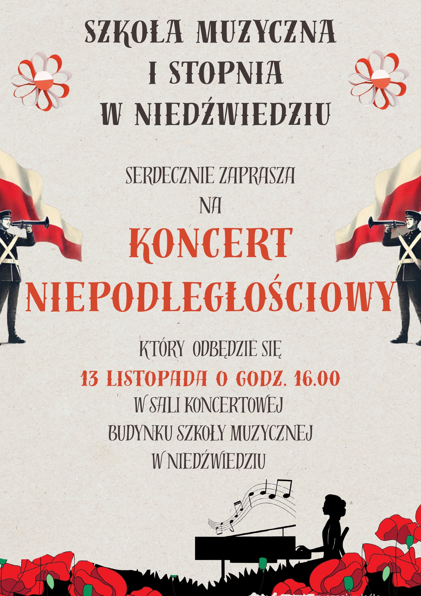 13 listopada w sali koncertowej Szkoły Muzycznej I stopnia w Niedźwiedziu odbędzie się koncert niepodległościowy. Rozpoczęcie o godz. 16.00.
