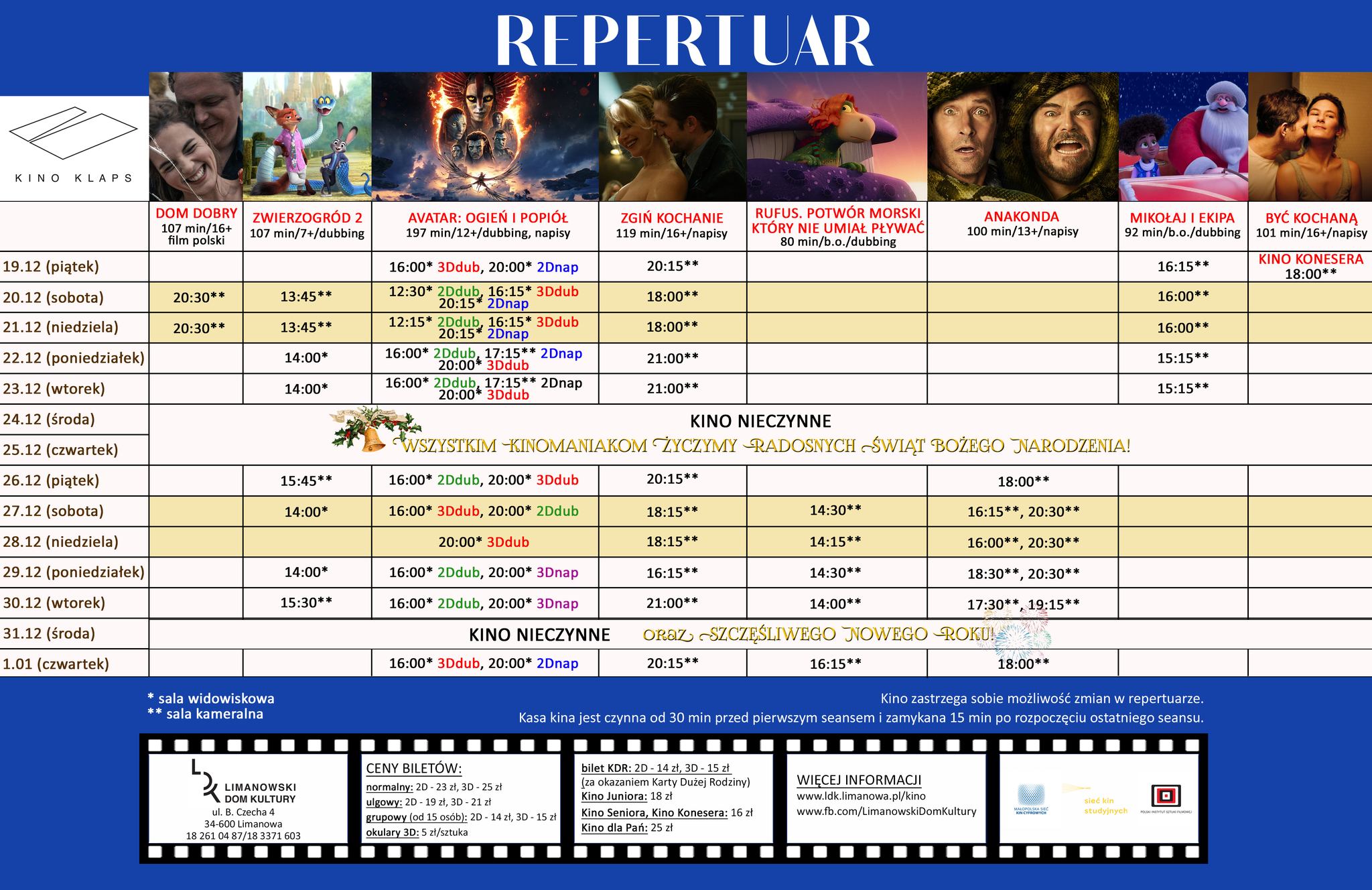 Zapraszamy do zapoznania się z ofertą limanowskiego kina „Klaps” na ostatnie dni 2025 roku.