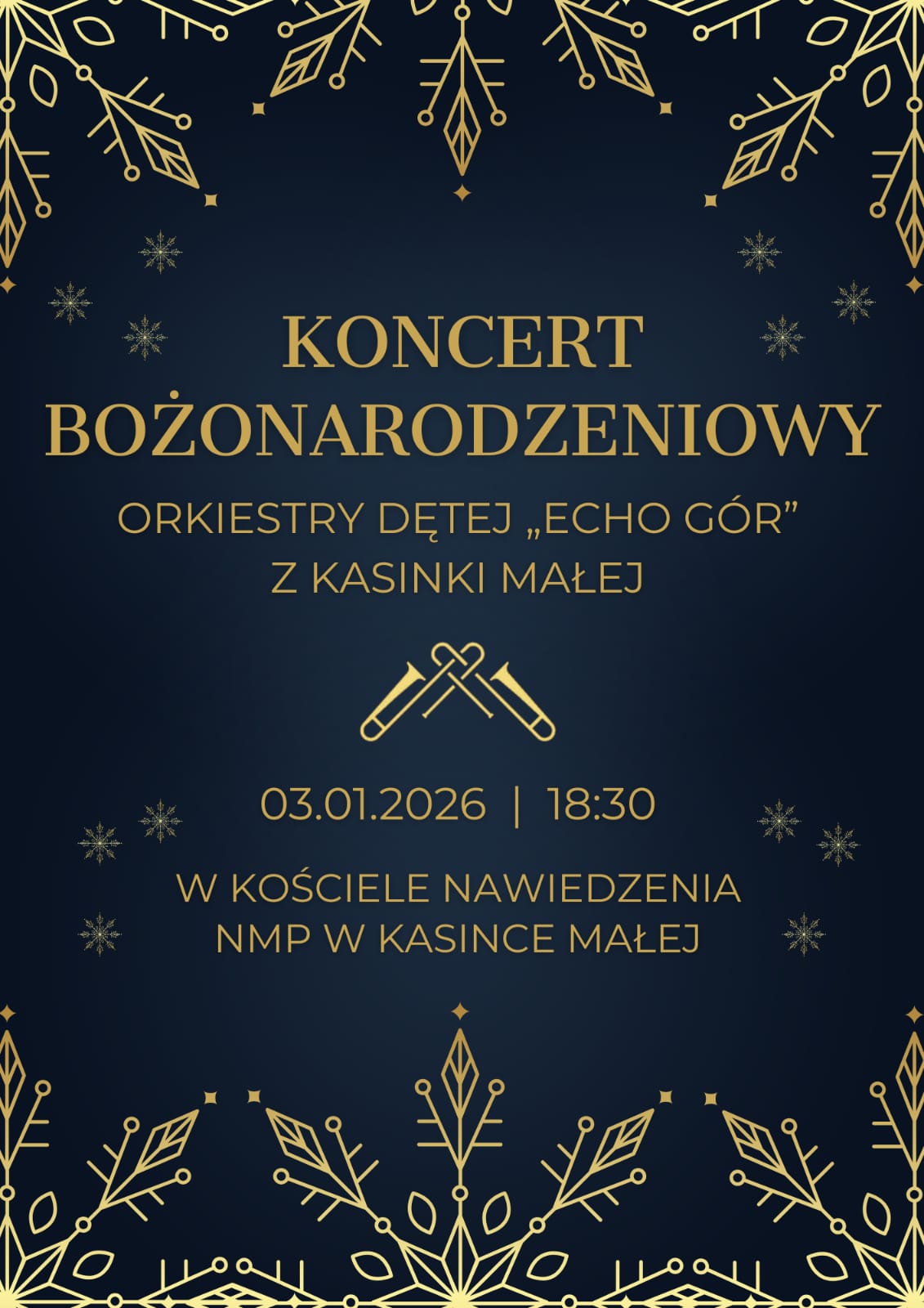 3 stycznia w kościele parafialnym w Kasince Małej odbędzie się koncert bożonarodzeniowy orkiestry „Echo Gór”. Rozpoczęcie o godz. 18.30.