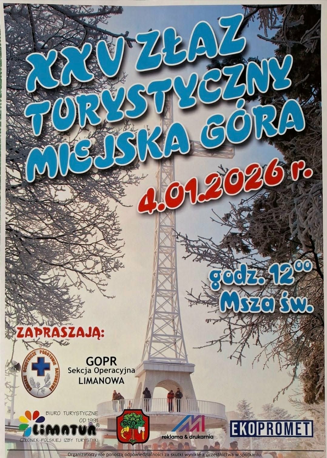 4 stycznia odbędzie się XXV Złaz Turystyczny na Miejskiej Górze. O godz. 12.00 zostanie odprawiona msza św. Do udziału w tym wydarzeniu zapraszają: Sekcja Operacyjna GOPR Limanowa, Biuro Turystyczne „Limatur”, Miasto Limanowa, „Ekopromet” i M-Reklama & Drukarnia.