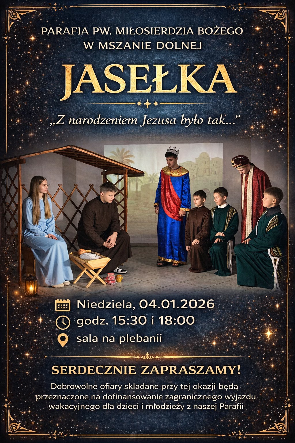 4 stycznia w sali na plebanii parafii pw. Miłosierdzia Bożego w Mszanie Dolnej zostaną wystawione jasełka pt. „Z narodzeniem Jezusa było tak…” Spektakl odbędzie się o godz. 15.30 i 18.00.