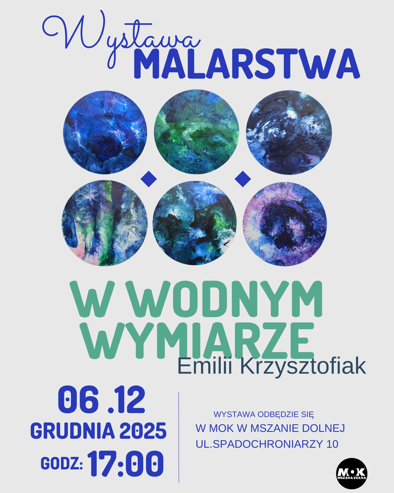 6 grudnia w Miejskim Ośrodku Kultury w Mszanie Dolnej odbędzie się wernisaż wystawy malarstwa Emilii Krzysztofiak pt. „W wodnym wymiarze”. Rozpoczęcie o godz. 17.00.