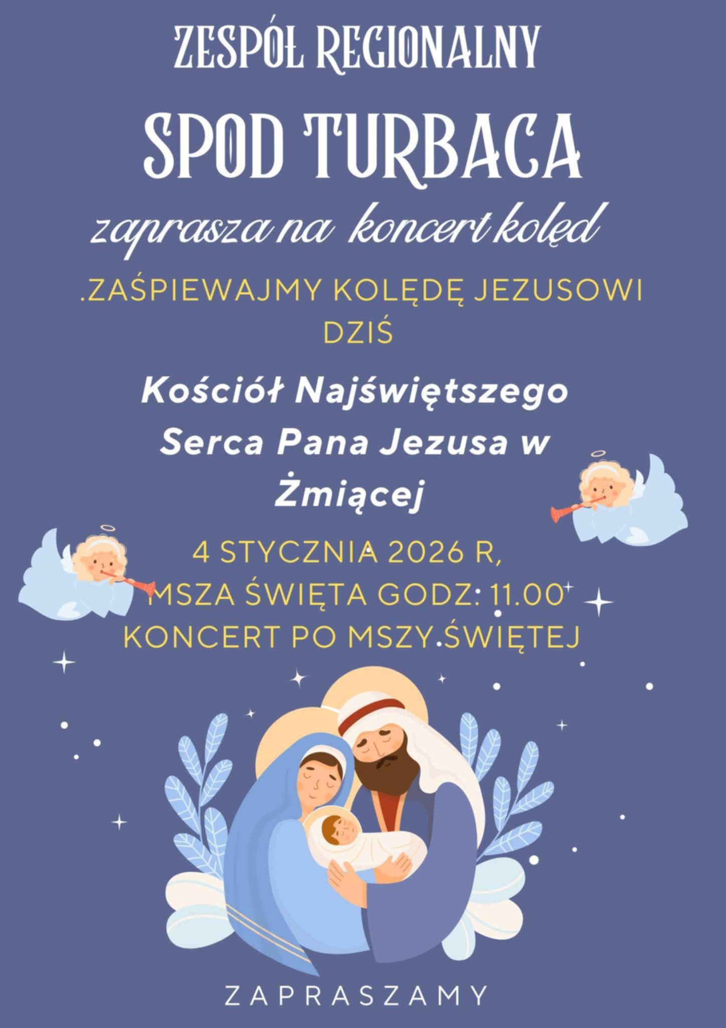 4 stycznia zespół regionalny „Spod Turbaca” wystąpi w kościele parafialnym w Żmiącej. Zespół weźmie udział w mszy św. o godz.11.00. Następnie odbędzie się koncert kolęd.