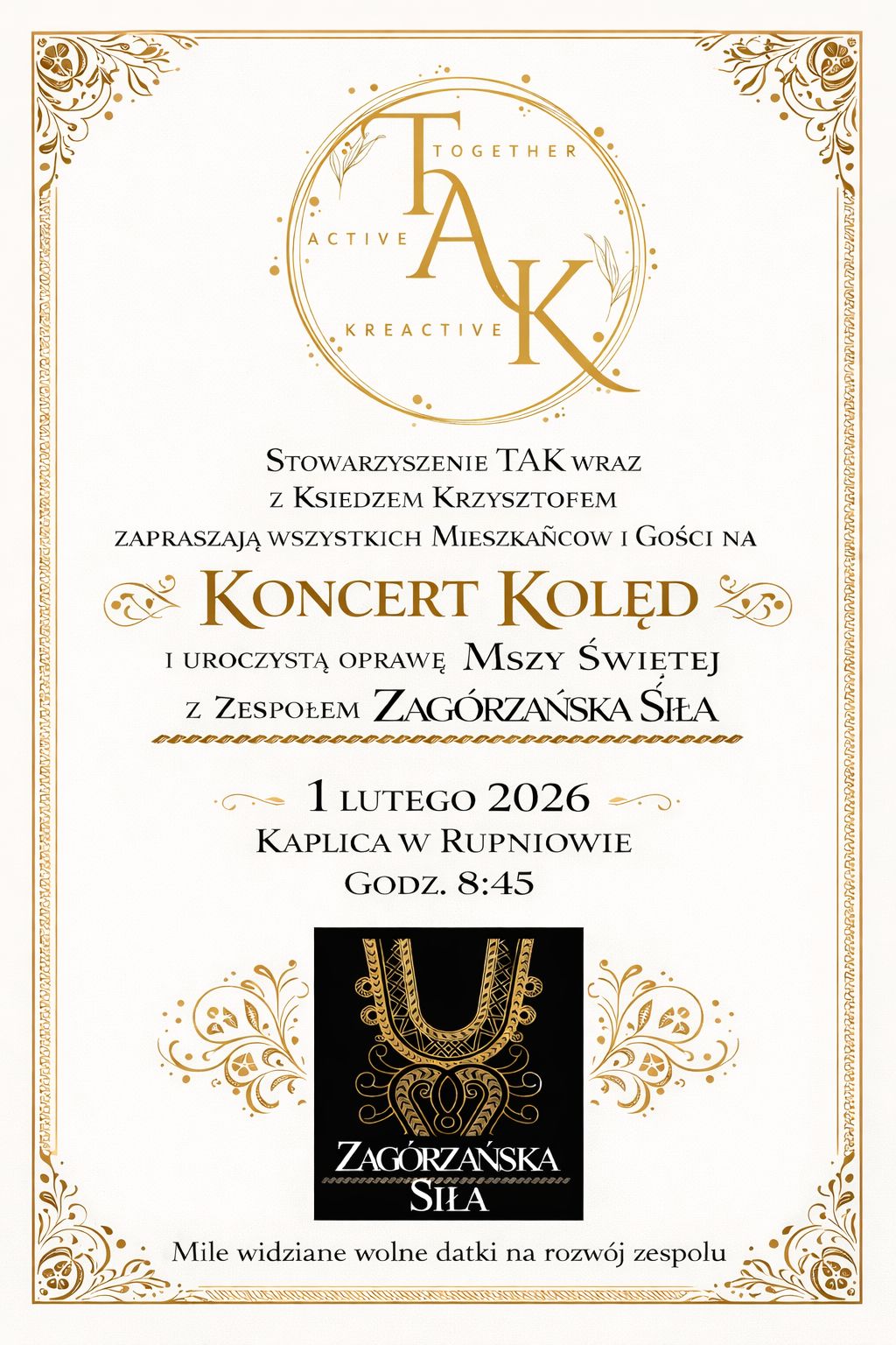 Stowarzyszenie „Together, Active, Kreactive” zaprasza na koncert o mszę św. w oprawie zespołu „Zagórzańska Siła”. Wydarzenie odbędzie się 1 lutego.