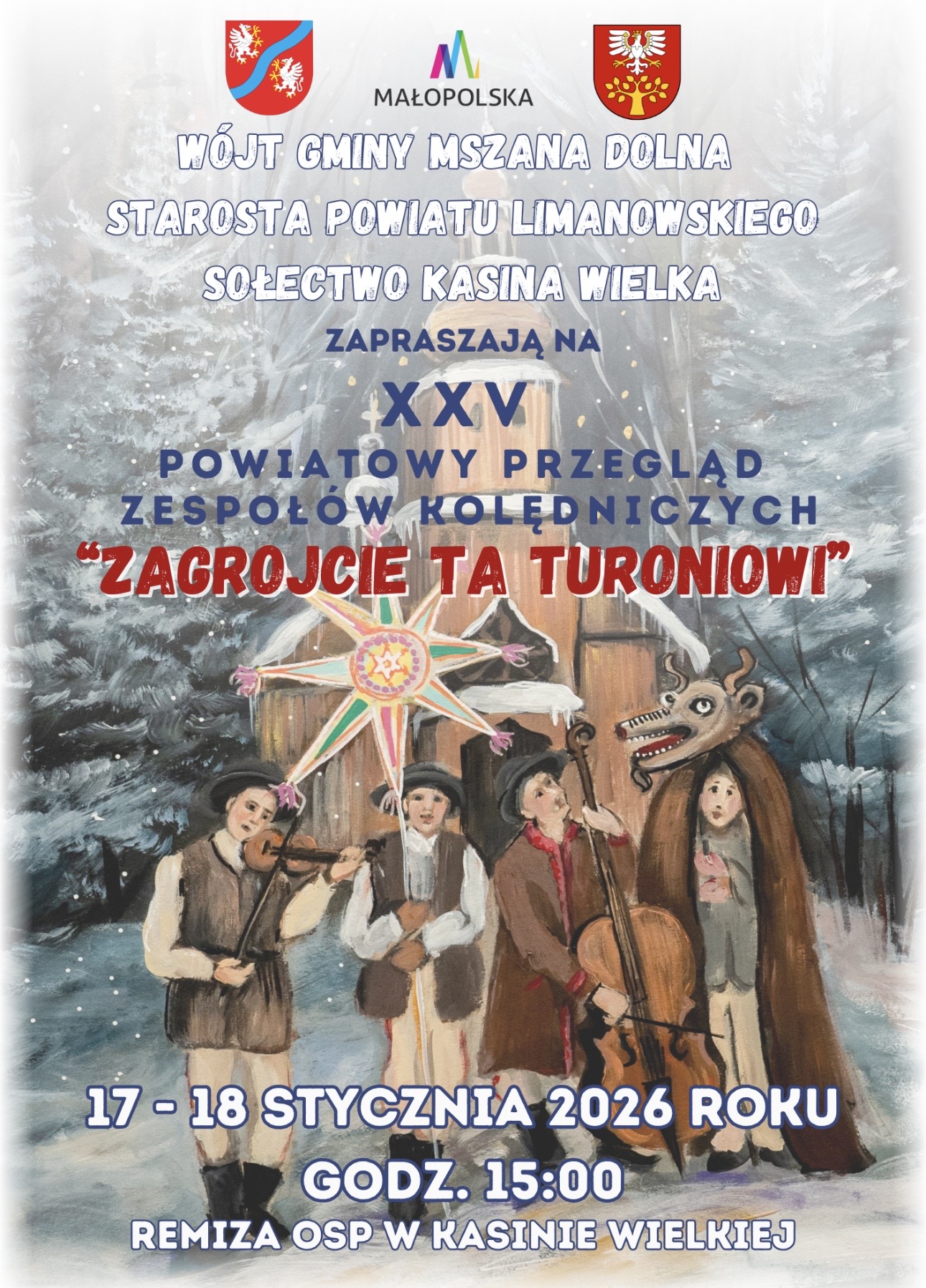 17 i 18 stycznia w remizie Ochotniczej Straży Pożarnej w Kasinie Wielkiej odbędzie się XXV Powiatowy Przegląd Zespołów Kolędniczych „Zagrojcie ta turoniowi”. Szczegółowe informacje znajdują się na plakatach.