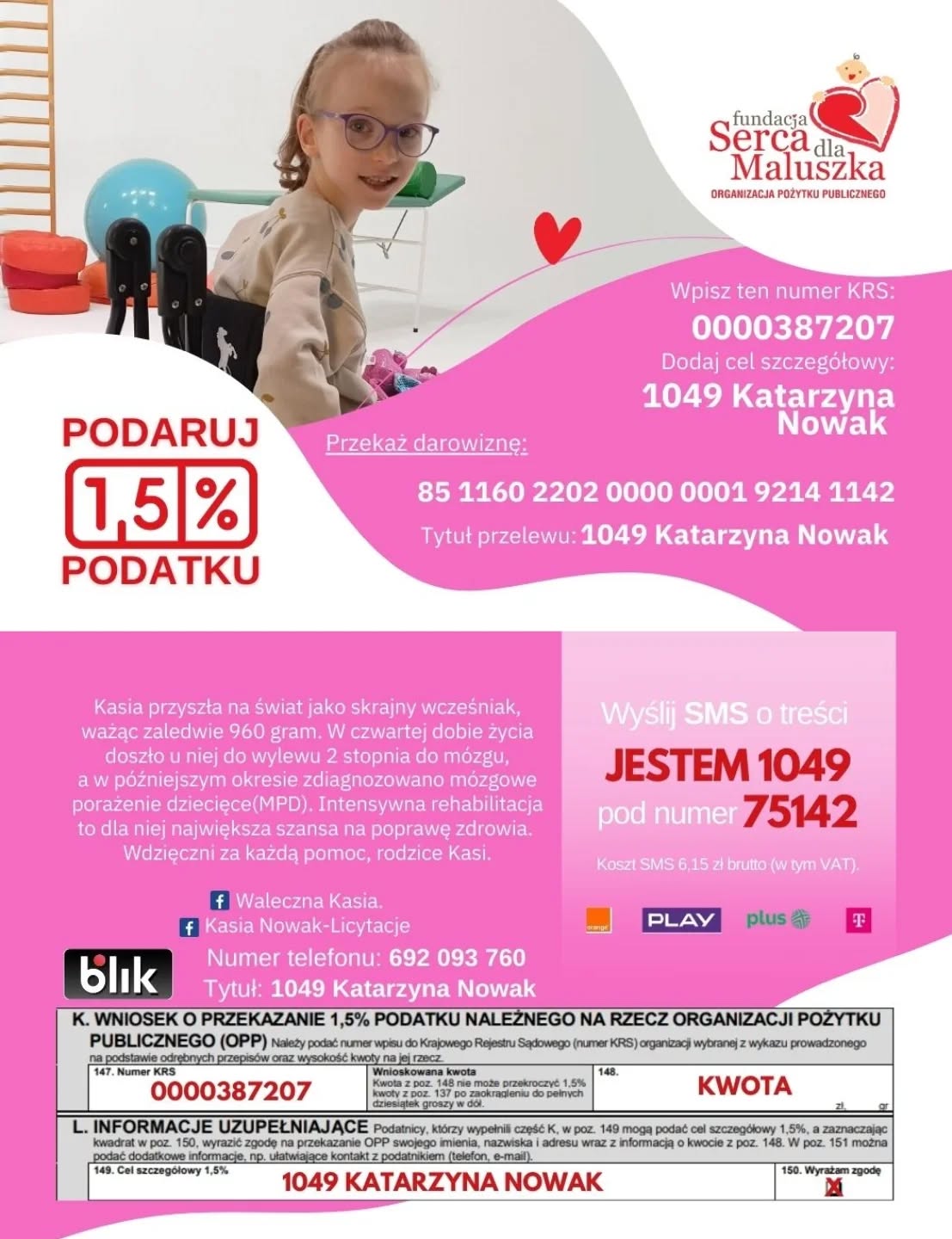 Kasia Nowak z Nowego Rybia urodziła się w 25 tygodniu ciąży, jako skrajny wcześniak, ważąc zaledwie 960 gramów. W czwartej dobie życia doszło u niej do wylewu 2. stopnia do mózgu, a w późniejszym okresie zdiagnozowano mózgowe porażenie dziecięce (MPD). Dziewczynka wymaga pomocy we wszystkich aspektach swojego funkcjonowania. Od narodzin jest pod opieką wielu specjalistów, a jej codzienność to terapia ruchowa, logopedyczna, psychologiczna, hipoterapia, osteopatia i wiele innych.