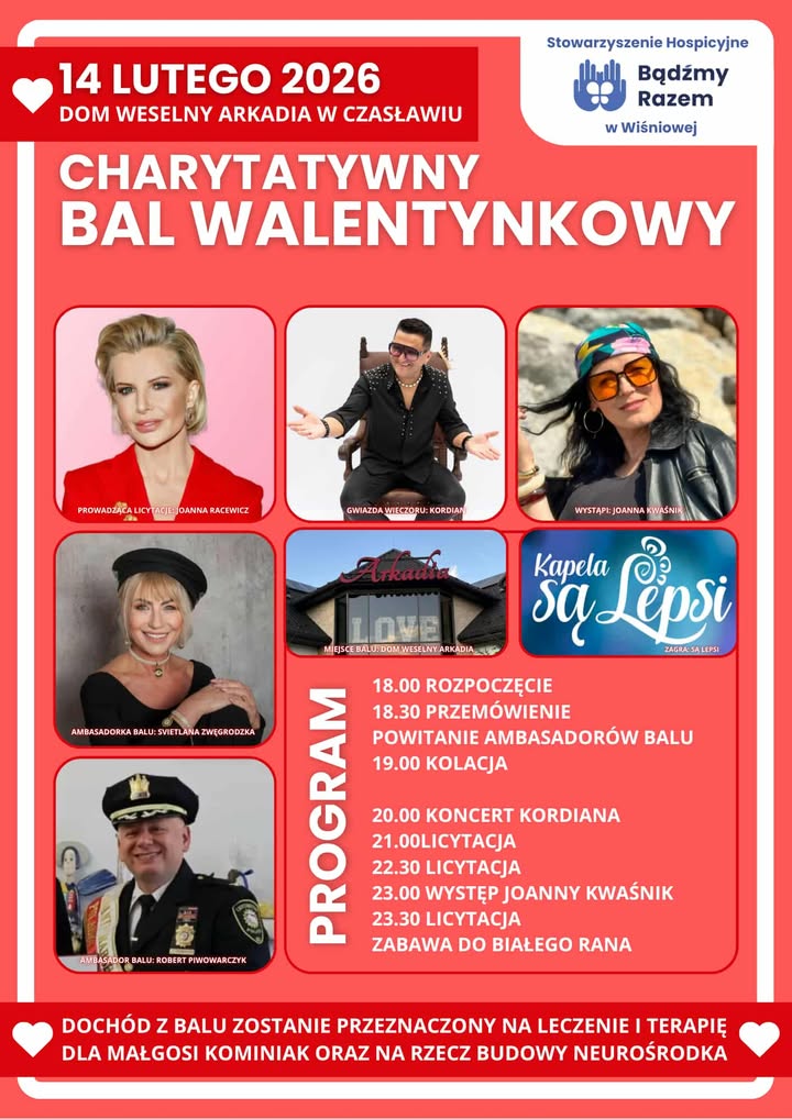 14 lutego w domu weselnym „Arkadia” w Czasławiu odbędzie się charytatywny bal walentynkowy. Do udziału w tym wyjątkowym wydarzeniu zaprasza Stowarzyszenie Hospicyjne „Bądźmy Razem” w Wiśniowej.