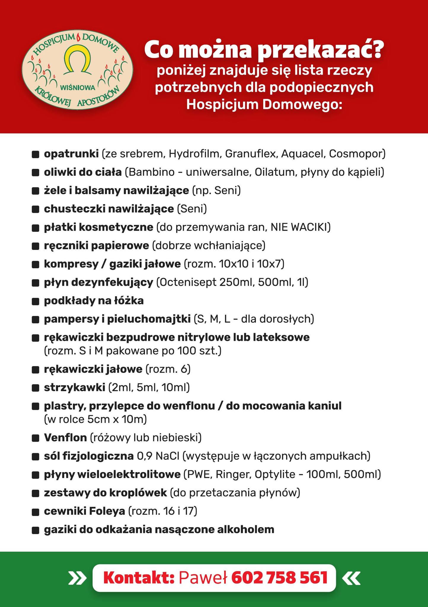 1 marca przy obu kościołach parafialnych w Mszanie Dolnej, kościele w Kasince Małej oraz kaplicy w Kasince Małej – Zagródcu odbędzie się zbiórka darów na rzecz Hospicjum Królowej Apostołów w Wiśniowej. Organizatorem akcji jest Wolontariat Parafii Miłosierdzia Bożego w Mszanie Dolnej.