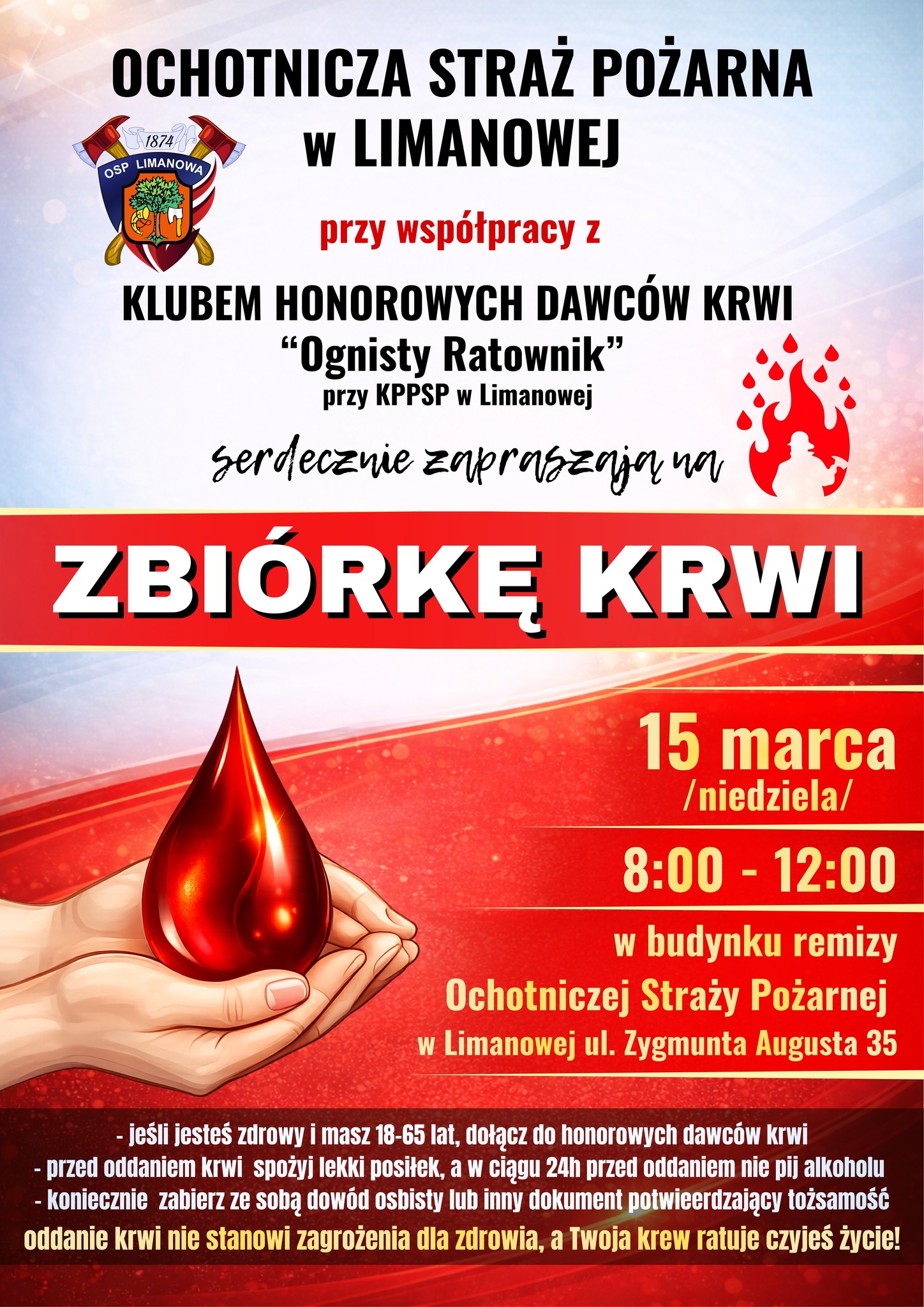 Druhowie Ochotniczej Straży Pożarnej w Limanowej zapraszają do udziału z zbiórce krwi. Akcja odbędzie się 15 marca od godz. 8.00 do godz. 12.00.