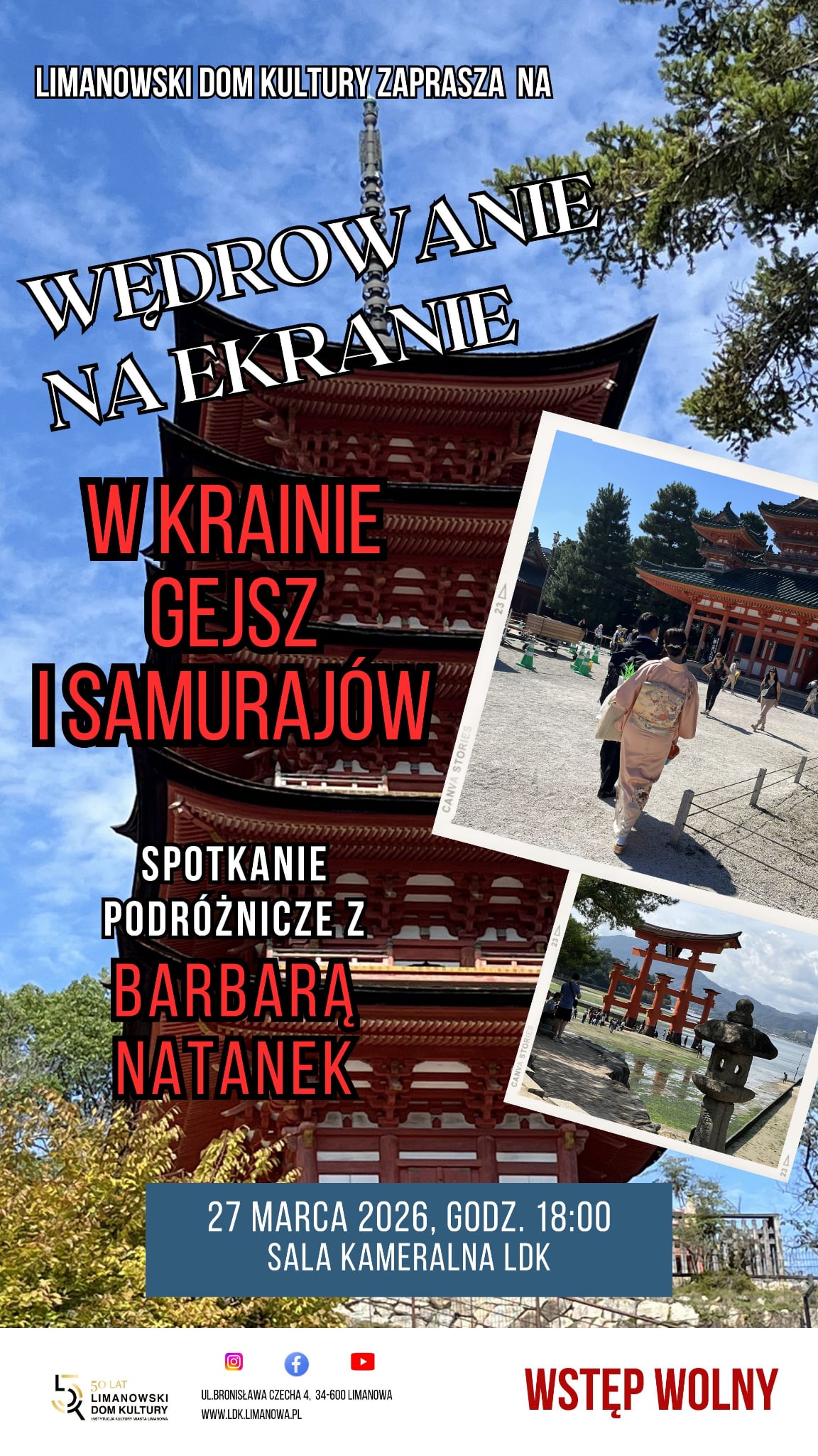 – Czeka nas niezwykła wirtualna podróż pełna inspirujących opowieści, pięknych zdjęć i fascynujących miejsc – od dawnego Edo, przez świątynie i zamki samurajów, aż po górę Fuji i Miyajimę. To doskonała okazja, by odkryć odległe zakątki świata bez wychodzenia z miasta! – zaprasza Limanowski Dom Kultury.