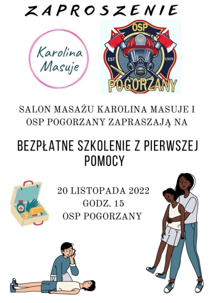 W najbliższą niedzielę (20 listopada) druhowie z Ochotniczej Straży Pożarnej w Pogorzanach zorganizują lekcje udzielenia pierwszej pomocy przedmedycznej. Salon Masażu…