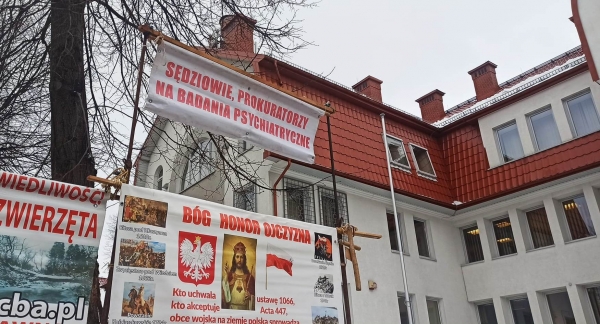 Dzisiaj przed Sądem Rejonowym w Limanowej rozłożono transparenty, których naczelnym hasłem jest sformułowanie "Sędziowie, prokuratorzy na badania psychiatryczne". Ten swego…