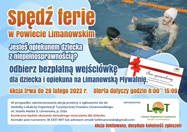 Lokalna Organizacja Turystyczna Powiatu Limanowskiego przygotowała bezpłatne jednorazowe wejściówki na pływalnię w Limanowej dla dzieci z niepełnosprawnościami oraz ich opiekunów.…