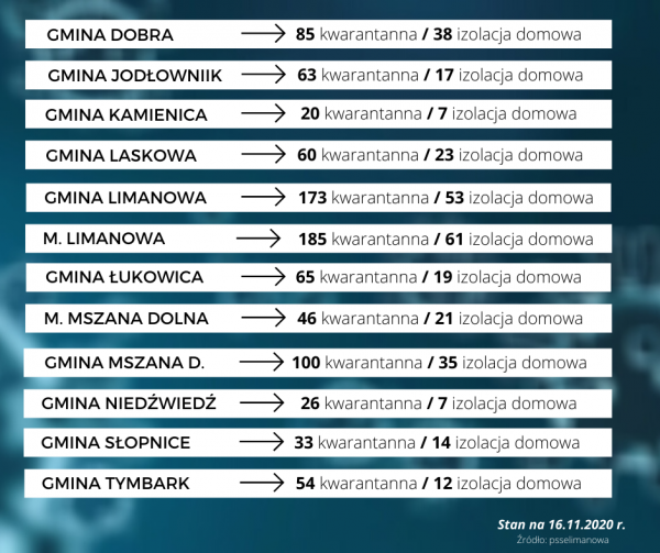 Powiatowa Stacja Sanitarno-Epidemiologiczna w Limanowej opublikowała dane na dzień 16 listopada. W powiecie limanowskim 910 osób przebywa na kwarantannie, a…