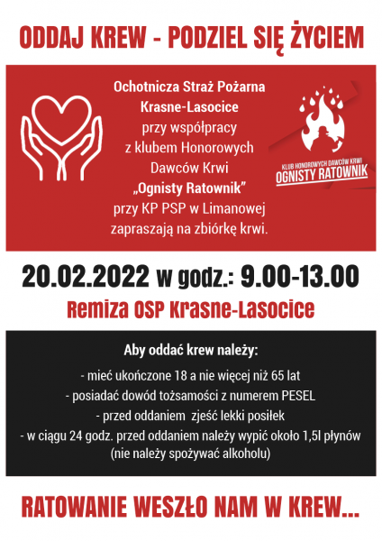 W niedzielę, 20 lutego, Ochotnicza Straż Pożarna w Krasnem-Lasocicach oraz Klub Honorowych Dawców Krwi „Ognisty Ratownik” przy Komendzie Powiatowej Państwowej…